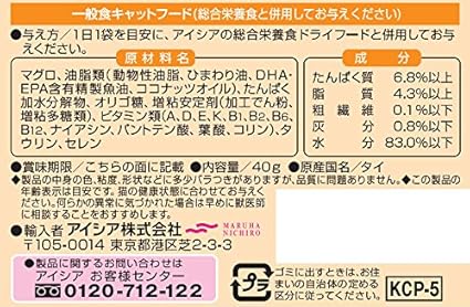 栄養成分:粗たんぱく質:6.8%以上、粗脂肪:4.3%以上、粗繊維:0.1%以下、粗灰分:0.8%以下、水分:83.0%以下、エネルギー:39kcal