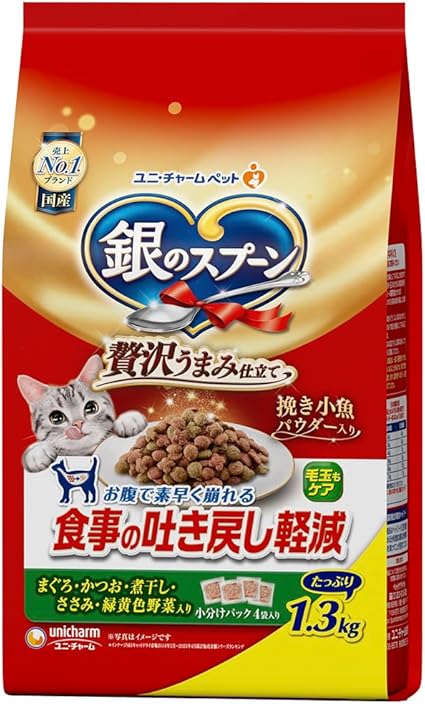 銀のスプーン キャットフード ドライ 贅沢うまみ仕立て 食事の吐き戻し軽減フード まぐろ・かつお・煮干し・ささみ・緑黄色野菜入り 1.3kg 国産 ユニチャーム
