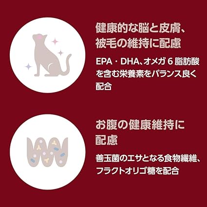 ◆健康的な脳と皮膚、被毛の維持に配慮◆ EPA・DHA、オメガ6脂肪酸を含む栄養素をバランス良く配合。室内で暮らす成猫の健康的な脳と皮膚、被毛の維持をサポートします。