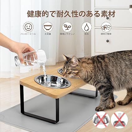 【高床式猫ボウルとマット】天然竹スタンド付き高床式キャットフードボウル、ステンレススチール猫ボウル2個。 高い位置は、猫が食べ物で遊んだり、水をかけたりするのを防ぎます。