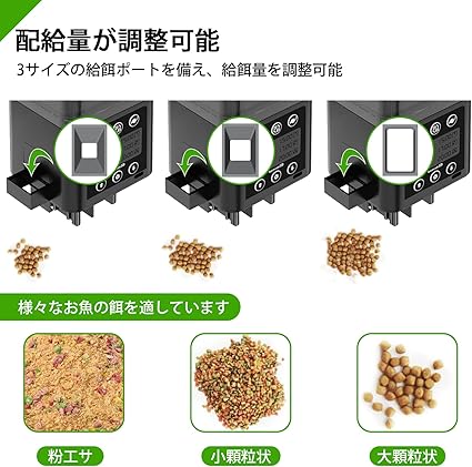 給餌量調整可能-魚自動給餌器はプッシュプル式給餌設計を採用し、3つの異なるサイズの交換可能な給餌クリップを装備し、給餌量