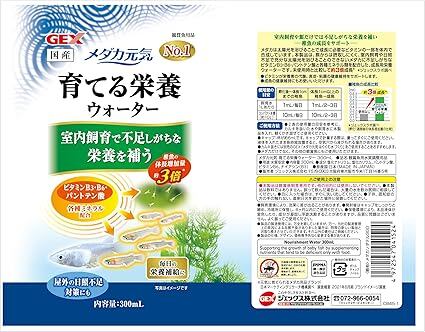 本製品は、餌から摂取しにくく、室内飼育や日照不足で充分な太陽光を浴びることのできないメダカに不足しがちなビタミンB3・B6・パントテン酸と各種ミネラル類を配合した、成長用栄養ウォーターです。