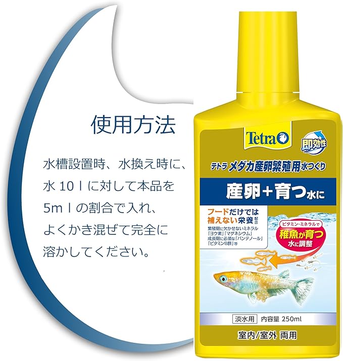 水道水に不足するビタミンB群や各種ミネラルが、水道水を自然環境水に近づけ、メダカの育成に適した水に調整します。