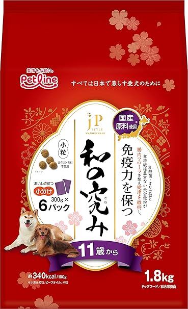 原材料:穀類(小麦全粒粉、小麦粉、米粉、小麦ふすま、米ぬか)、豆類(脱脂大豆、おから)、肉類(ミートミール、チキンミール、チキンレバーパウダー)、油脂類(動物性油脂:ビーフオイル、フィッシュオイル:DHA・EPA源)、ビートパルプ、糖類(フラクトオリゴ糖)、β−グルカン、セレン酵母、乳酸菌、ビタミン類(A、D3、E、K3、B1、B2、パントテン酸、ナイアシン、B6、葉酸、ビオチン、B12、C、コリン)、ミネラル類(カルシウム、ナトリウム、塩素、鉄、コバルト、銅、マンガン、亜鉛アミノ