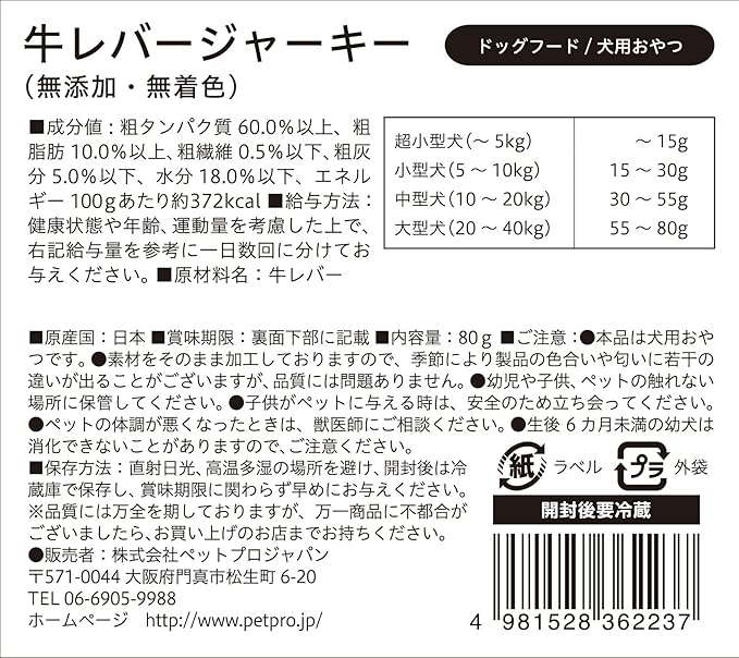 ペットプロ 犬用おやつ 国産おやつ 牛レバージャーキー(無添加・無着色) 80g 80グラム (x 1)