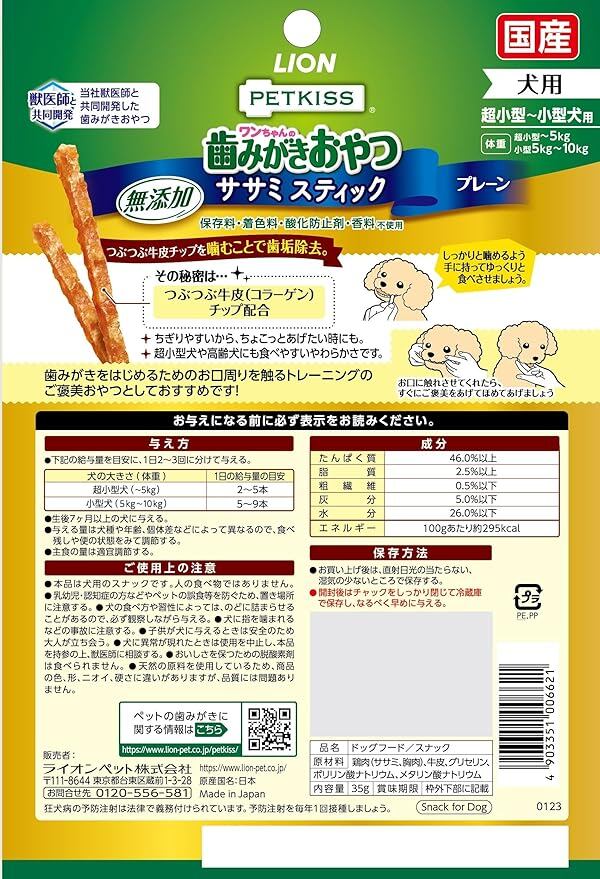 原材料:鶏肉(ササミ、胸肉)、牛皮、グリセリン、ポリリン酸ナトリウム、メタリン酸ナトリウム