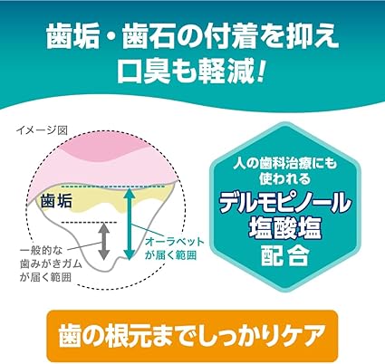人の歯科治療にも使われる「デルモピノール塩酸塩」配合。歯垢・歯石の付着を抑え、口臭を軽減。