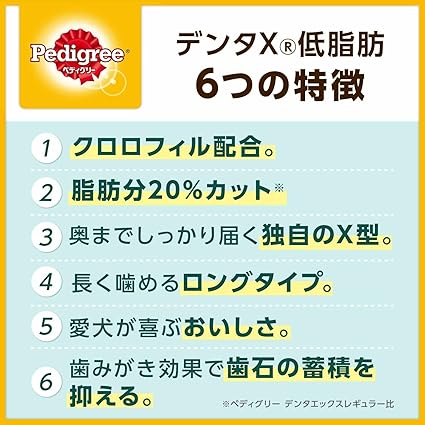 体重の気になる犬用の低脂肪タイプ。X型を噛んで歯石の蓄積を抑える歯みがき専用ガム