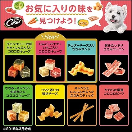 原材料:小麦粉、大豆粉、小麦たん白、チーズ(プロセスチーズ、チェダーチーズ)、粉末水あめ、動物性油脂、乳清たん白、コラーゲン(豚由来)、酵母エキス、加工でん粉、グリセリン、プロピレングリコール、D-ソルビトール、乳酸ナトリウム、pH調整剤、リン酸塩(Na、K)、香料、保存料(ソルビン酸K)、酸化防止剤(ローズマリー抽出物、ミックストコフェロール抽出ビタミンE)、着色料(黄4、赤106)