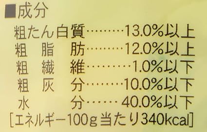 栄養成分:粗たん白質:10%以上、粗脂肪:13%以上、粗繊維:0.5%以下、粗灰分:6%以下、水分:40%以下