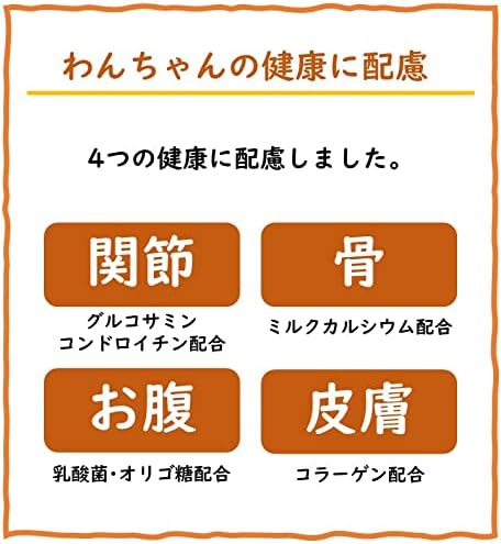 関節、骨、お腹、皮膚の健康に配慮した素材を配合