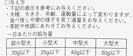栄養成分:粗タンパク質 60.0%以上、粗脂肪 3.0%以上、粗繊維 1.0%以下、粗灰分 5.0%以下、水分 16%以下、305kcal/100g
