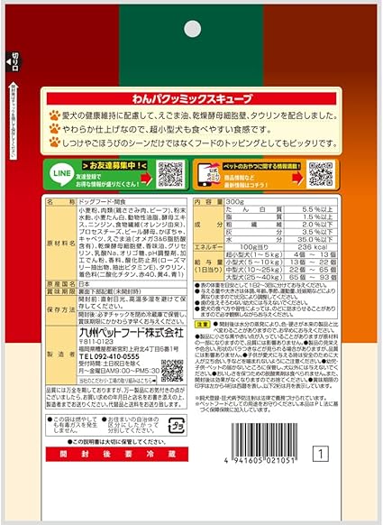 小麦粉、肉類(鶏ささみ肉、ビーフ)、粉末水飴、小麦たん白、動物性油脂、酵母エキス、ニンジン、食物繊維(オレンジ由来)、プロセスチーズ、ビール酵母、かぼちゃ、キャベツ、えごま油(オメガ3&6脂肪酸含有)、乾燥酵母細胞壁、香味油、グリセリン、乳酸Na、オリゴ糖、pH調整剤、加工でん粉、香料、酸化防止剤(ローズマリー抽出物、抽出ビタミンE)、タウリン、着色料(二酸化チタン、赤40、黄4、青1)