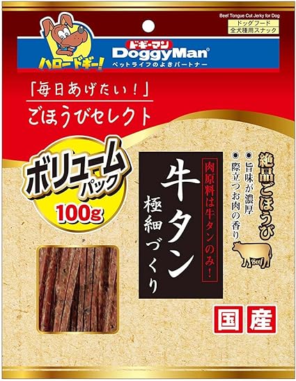●肉原料は牛タンのみ。お肉の香りが際立つごほうびスナック。