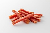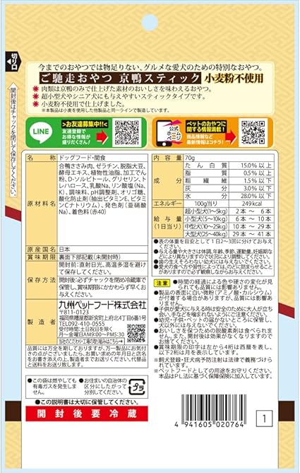 原材料/合鴨ささみ肉、ゼラチン、脱脂大豆、酵母エキス、植物性油脂、加工でん粉、D−ソルビトール、グリセリン、トレハロース、乳酸Na、リン酸塩(Na、K)、調味料、pH調整剤、オリゴ糖、酸化防止剤(抽出ビタミンE、ビタミンCナトリウム)、発色剤(亜硝酸Na)、着色料(赤40)