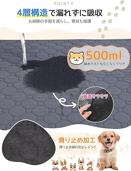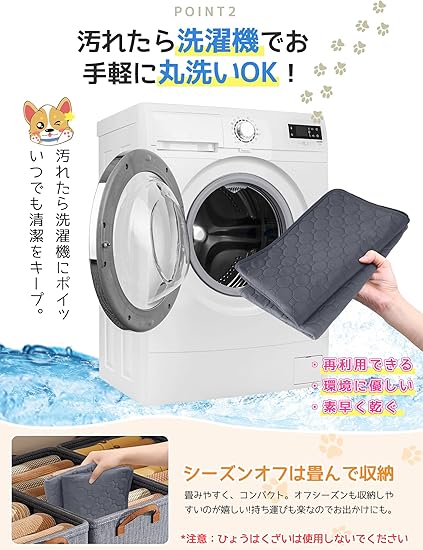 【優れた耐久性&卓越した性能】厳選された高品質の素材で設計、キルト加工で丈夫に作られているから耐久性はとても高く、毎日のお洗濯にも耐えられます。2枚セットなので洗い替えがあって、汚れても大丈夫です。また、このペットトイレマットはペーパーシーツのようにボロボロになったり、それを食べてしまったりという心配もなく、ゴミの量も削減できるので地球環境にもやさしい。