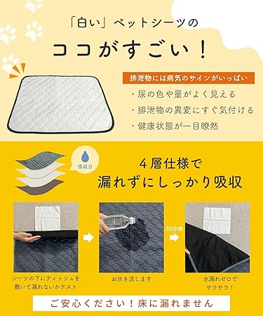 【健康状態がしっかり見える】 ワンちゃんの排泄物には病気のサインが沢山!ホワイトカラーは真っ白なシートなのでワンちゃんの異変に早期に気づくことが出来ます。定期的な尿の色と量の変化確認は病気の早期発見につながります。
