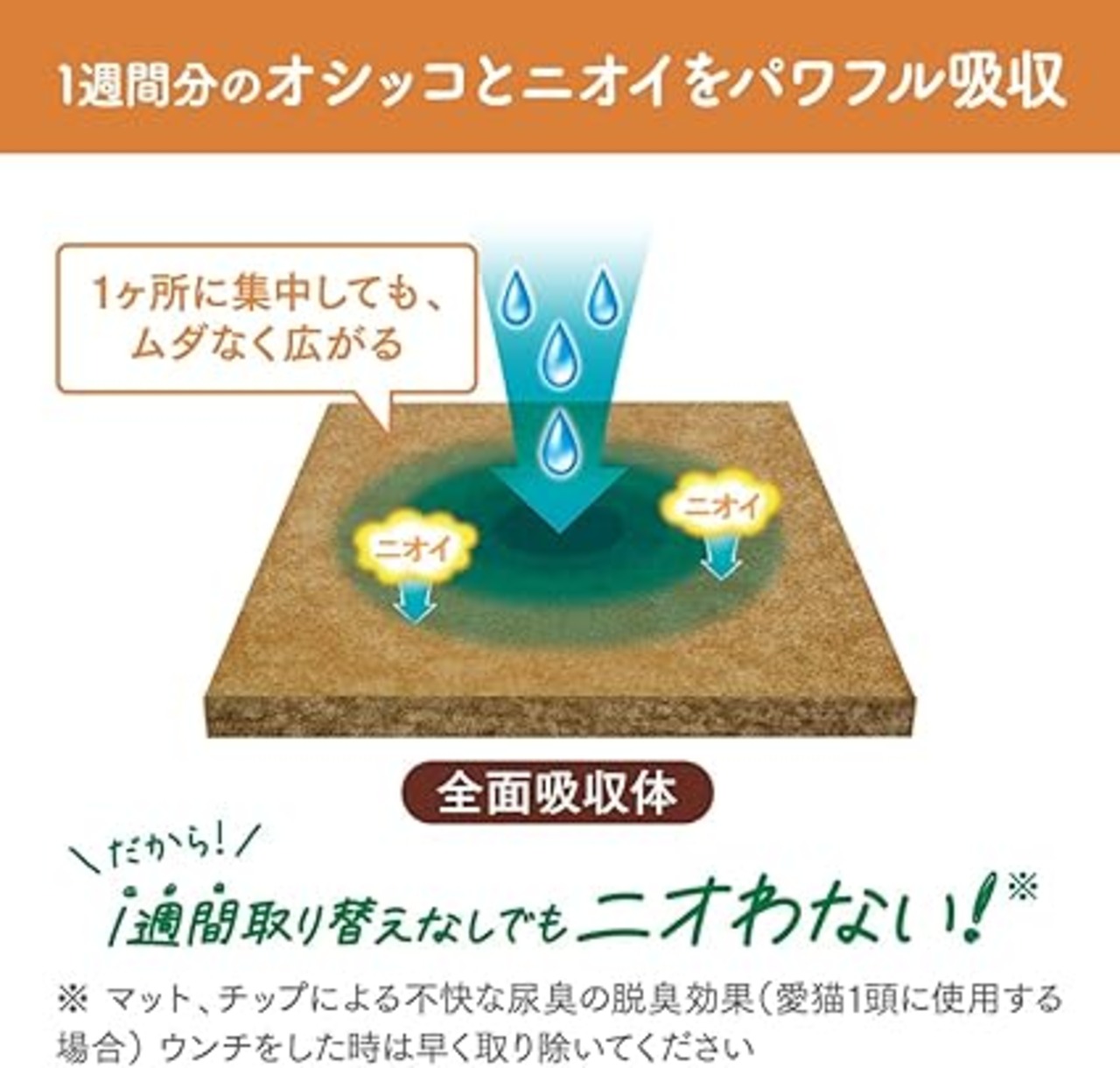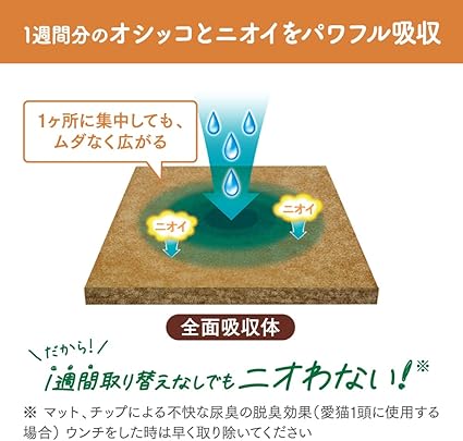 尿量が多くても1週間分の尿とニオイをたっぷり吸収! アンモニア臭もカット。取り替えは週1回でOK!