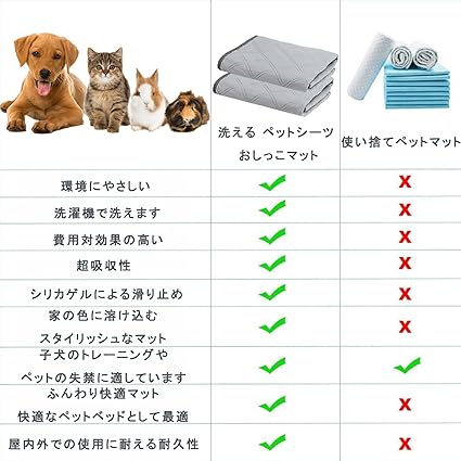 【強い実用性&幅広い用途】室内の床、ソファ、ペット用トイレ、ペットベッド、犬小屋、キャリーバッグ、ペットの囲い、ペットケージはもちろん、旅行時の車内でも使用できます。家具、敷物、ペットベッド、犬小屋などをペットの毛や汚れから守ります。対象:小型犬~大型犬、子犬~高齢犬、介護犬、猫、うさぎ、モルモットなどの動物。病気ペット、失禁高齢犬、子犬の授乳、術後介護、旅行などに最適です。