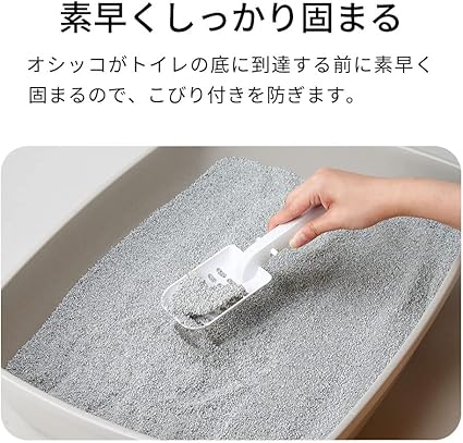無着色、猫を刺激しない微香料。人にも猫にも好まれやすい天然由来の香り。水分に砂が反応して香りが強くなるので、排出時にグリーンな香りが広がります。新しいトイレに替えるときに猫を誘導する場合や、粗相を