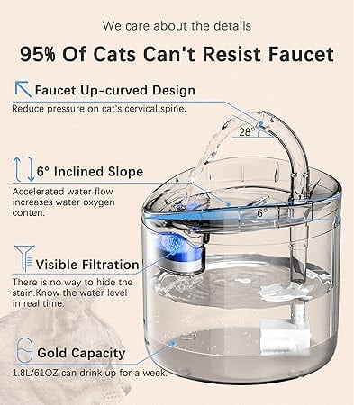 【2種類出水モード】蛇口、噴水 2種類出水モード、ペットに多様な水飲み体験を与えます。くぼんだ貯水ボウルと水の循環システムを採用し、水と空気の接触面積と時間を増やし、より多くの酸素を水に溶け合いて、ペットに健康と活力をもたらすようにデザインされています。ペットは生れて流れ水が好き。HAPUP猫 水飲み器、24時間循環式濾過システムで、新鮮なお水を提供して、愛猫の飲水量が増やせます。