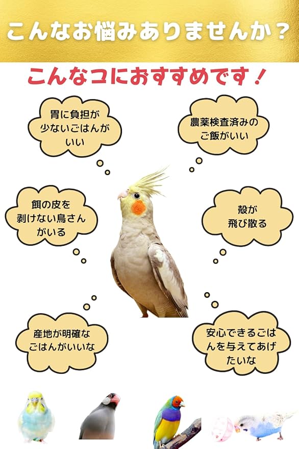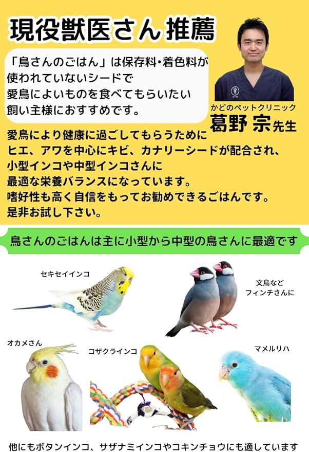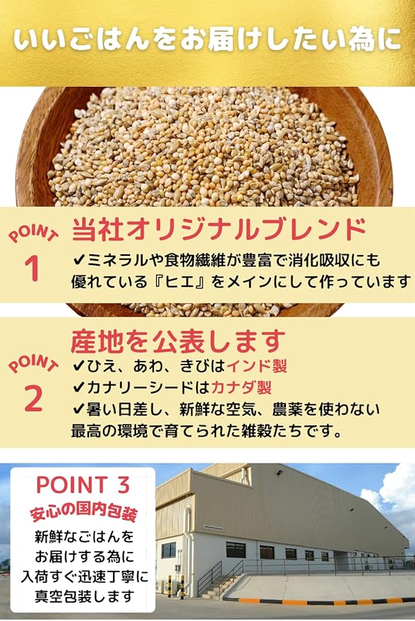 【栽培時農薬不使用】鳥餌 作って40年の 鳥の餌 やさんに協力いただき作りました。鳥 さんの 餌 です。 セキセイインコ や マメルリハ コザクラインコ ボタンインコ アキクサインコ など インコ 科の 餌 や 文鳥 や カナリア キンカチョウ ジュウシマツ コキンチョウ の様な フィンチ 類の えさ に、小さな鳥さんから オカメインコ コザクラインコ などの中型鳥さんまで 雑穀 が大好きな 鳥 さんに毎日の主食としてお使い頂けます。愛鳥さんの初めてのごはんにもおすすめです。
