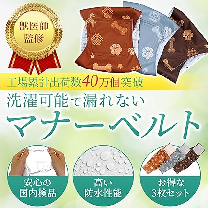 【獣医師監修のマナーベルト】マーキングやおもらし対策、介護時などに大活躍の漏れにくいマナーベルトです。吸水層付きで漏れをしっかりガード。色の違う3枚のセットになっており、見た目の可愛さもポイントです。XS、S、Mの3サイズ用意いたしましたので、ワンちゃんのサイズに合わせてお選びください。