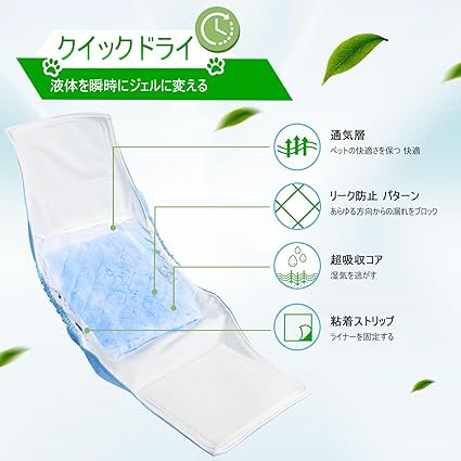 優れた吸収性: 犬用おむつパッドは最大 12 液量オンスを吸収し、ペットを昼夜を問わずドライに保ち、皮膚への刺激を軽減します。多層コアが液体を簡単に分散させてロックし、強力な漏れ防止を実現します