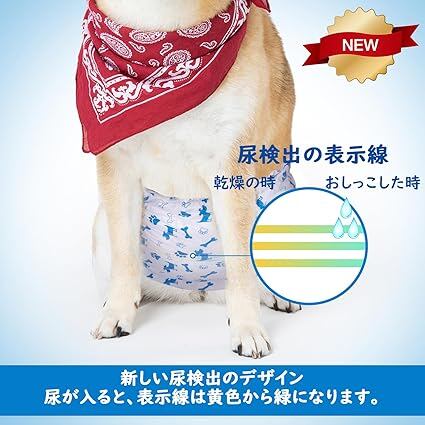 思いやりのあるデザイン:新しい尿検出のデザイン、ワンちゃんがオシッコをしたら、オムツが湿気を検出することができ、表示線は乾燥状態の黄色から湿気の緑へ変色します、おむつ専用のマジックテープを採用し、ワンコの体によって調整、ぴったり装着できます、ワンタッチテープで幅が広く、何度もつけ直しでき、ペットの体型にフィットしていつも快適、腹巻風なので、巻くだけで簡単に装着できます
