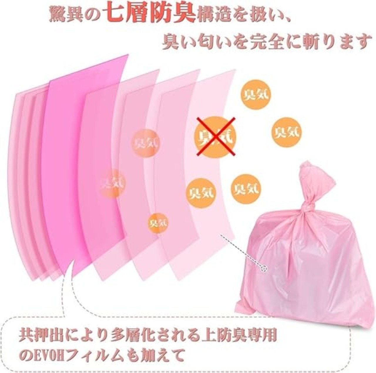 【圧倒的な防臭力】素材:ポリエチレン(PE)、EVOHフィルム。本社特有革新的な技術で多層のフィルム(PE)とEVOHフィルム(防臭フィルム)共押出により多層化される匂いを完全に抑えらる超強力な「ニオイ斬り」防臭袋です。抜群な消臭力を持ちながら破れにくくて嫌な臭い匂いをしっかりゴミ袋に閉じ
