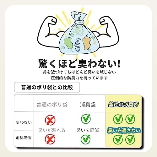 【驚異の臭わないゴミ袋】弊社の防臭袋は密閉性の高い素材で作られており、臭いの漏れを効果的に防止します。快適で臭いのない環境をお楽しみください。破れや漏れにくいので、長期間使用することができ、安心してご利用いただけます。