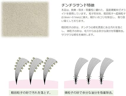 【 悪臭やアレルギー物質も除去 】サンコーのチンチラサンドに使われているゼオライトは水分を通し、油分や悪臭、アレルギー物質を吸着する国産の硬質系ゼオライトを使用しています。チンチラの被毛表面にある汚れを落としサラサラな毛並みを維持します