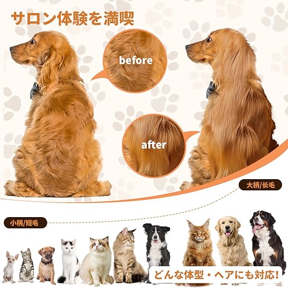 【ブラッシングが簡単に!ブラシの針先3つの秘密】このペットブラシの針には三つの特徴があります:①140°のカーブデザインで、ペットの体型にぴったりフィットします。②220本の細かい針があり、毛や絡まりを効率的に取り除きます!③優れた弾力性で、毎回のブラッシングが快適になります。これらのデザインは毛を簡単に取り除くだけでなく、肌を優しくマッサージし、ペットの毛並みをいつも滑らかで美しく保ちます!