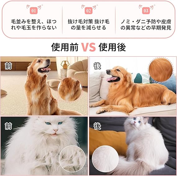 【2023年最新のミスト機能】従来品と違い、この最新的なペットブラシはミスト機能が搭載されています。普通のスリッカーブラシより、ミスト機能で静電気を防ぎ、抜け毛が散らばらなくなり、毛の汚れや絡まりを取り除き、美しい毛並みに仕上げることができます。水タンクに水、消臭剤などを入れて、噴霧スイッチを押すだけで、噴霧機能を起動できて水が超音波化にされ、繊細なミストを吹き出します。