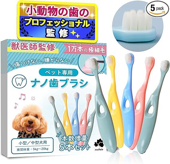 犬 歯ブラシ 小型犬 【小動物歯科研究医が監修x1万本の極細毛】 ナノコーティング 歯磨き ガイド付 奥まで届くカーブ 抗菌 抗ウイルス 体重5kg-20kg 毛高10mm maffole (波型ヘッド カラフル) | Pettopoint