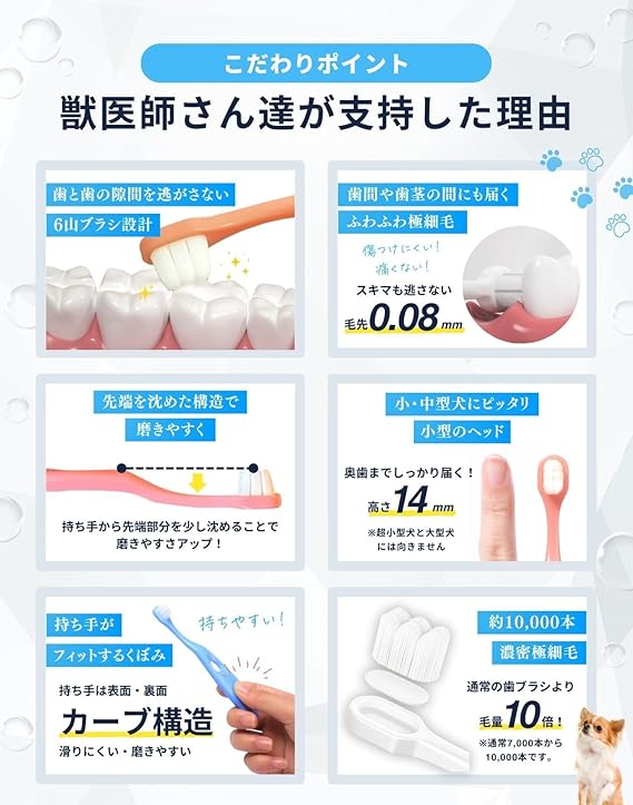 【犬用歯ブラシの新定番】小型犬にもぴったりな犬用歯ブラシで、毎日の歯磨きが楽しくなるデザイン。6山構造が犬の歯の細部まで届き、徹底ケアが可能です。