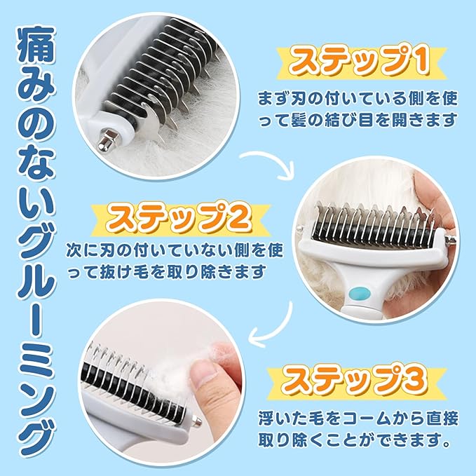 【結び目・浮き毛解消】お家でペットを飼っていると、どうしても、結び目や浮き毛などのトラブルに遭遇します。 ご心配なく、当社の両面ペットもつれほぐしコームは完璧なソリューションを提供します。