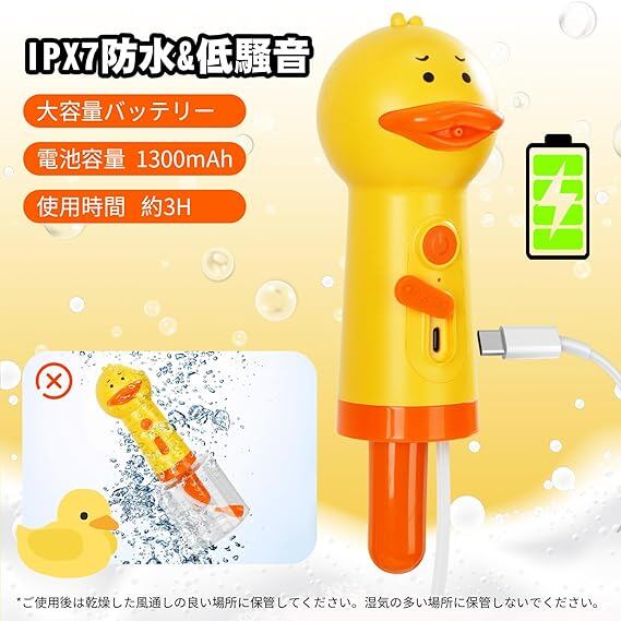 【IPX 7防水&低騒音】カルガモ電動気泡機の防水レベルはIPX 7防水。充電口にはゴム栓が付いており、水蒸気の心配なく浴室で安全に使用できるようになっています。低騒音設計により、ペットが驚きやストレスを受けないようにすることができます。*注意