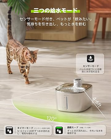 【スマート3つ給水モード】猫給水器は120°センサーが搭載し、ペットが近づくと自動的に給水します。流れる水でペットに水飲み