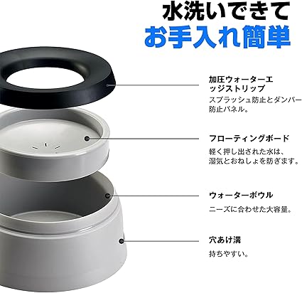 【飛び散り防止】:浮輪はカバーしていて、飲むときの飛び散り防止には最高!水は浮輪の中心部から湧き出すして、水を常に新鮮な状態に保つ仕組みがあります。飲み癖のあるペットに最適!
