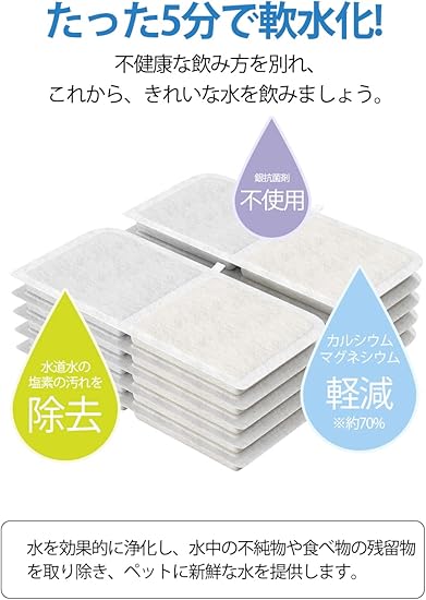 【多重濾過】①ヤシ殻活性炭:高い吸着能力があり、塩素臭やバクテリアを素早く効果的に取り除きます、ペットが病気になることを防止できます。②イオン交換樹脂:水道水に含まれる重金属イオンを取り除いて水質を軟化します。③高密度マイクロ綿:水中の埃、髪の毛、食べカスなどの汚れ物をしっかり取り除きます。