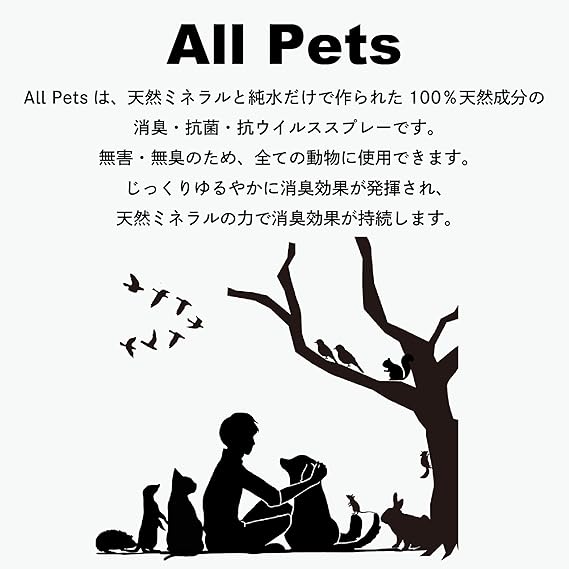 All Petsは天然ミネラルと純水だけで作られた100%天然成分の消臭・抗菌・抗ウイルススプレーです。