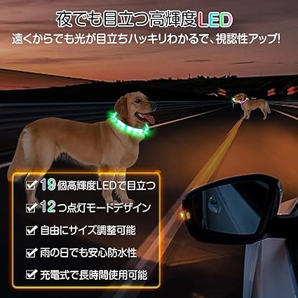 【超高輝度・高い視認性】ペット 光る首輪は19個の高輝度LEDを採用されて犬の視認性と安全性を最