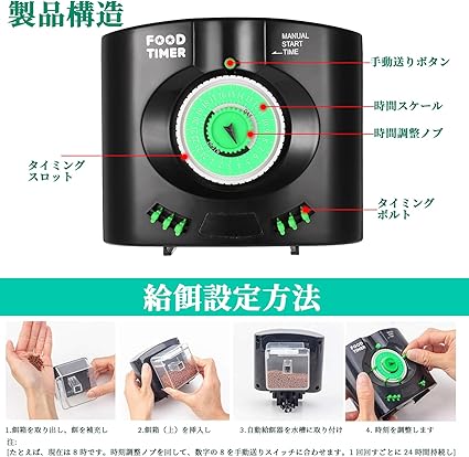 【給餌時間と給餌量を設定自由】出張、お出かけの時、魚の給餌心配要らない、自動給餌器があります。1日1回~10回(10つの定時ボルトが付き)まで配給回数設定が可能で、毎回1回転可能です。