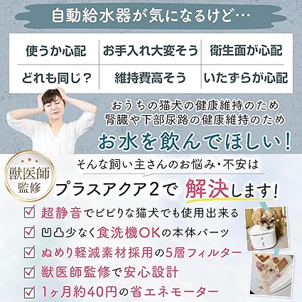 うちのこエレクトリック プラスアクア2 【獣医師監修】 猫 犬 自動給水器 給水器 水飲み器 8.2dB 食洗機対応 お手入れらくらく フィルター5層構造 KDF(銅と亜鉛の合金) ぬめり軽減 安心の日本メーカー サポート付 活性炭フィルター ヤシ殻活性炭 イオン交換樹脂 | Pettopoint