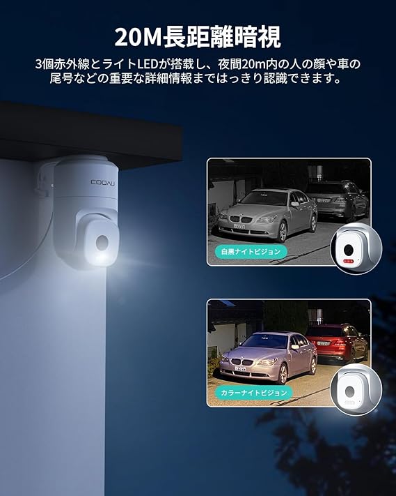 【400万高画質・360°広範囲視野・可帰位自動追跡】高性能4MPのCMOSセンサーを搭載し、高解像度(2560*1440P)と8倍のデジタルズームで遠距離でも人顔や車のナンバーまでの細部をはっきり見えます。水平350°/垂直90°回転機能が搭載され、いつでもスマホからレンズの向きを好きな角度に調整し、戸建の車庫と入り口が360°全方位見渡せて、死角なしでの監視が可能です。自動追尾機能が付き、人を検知するとすぐに自動的に追跡し、重要な瞬間を逃さず全部記録します。