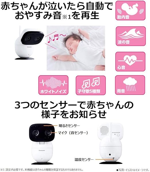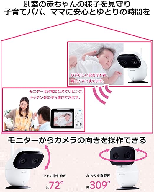 モニター機の光と音で赤ちゃんの様子をお知らせします。 使用可能距離:約100 m(見通し距離) 撮像素子:CMOS 30万画素 モニター機使用時間(ワイヤレス時):約5時間(周囲温度20 ℃、満充電の状態から連続
