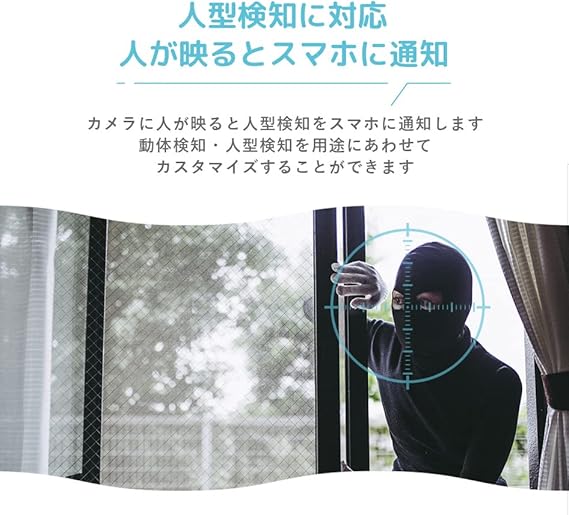 【人型検知に対応】カメラに人が映ると人型検知をスマホに通知。動体検知、人型検知を用途に合わせてカスタマイズすることができます。防犯性に優れた一台です。