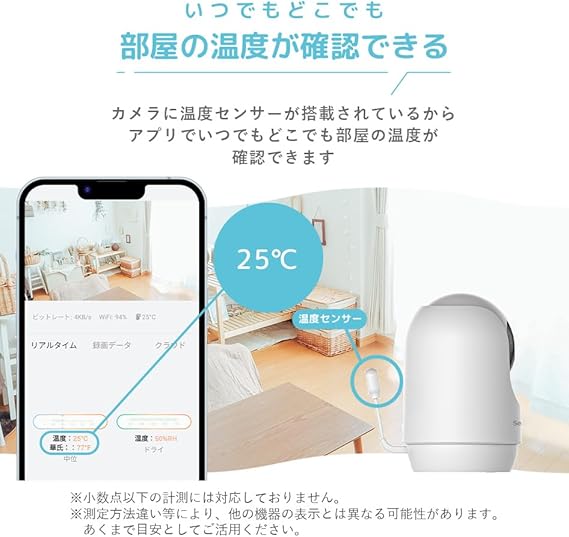 【湿温度機能】カメラに湿温度センサーが搭載されているので、湿度と温度の両方をスマホアプリから確認することができます。ペットの見守りなどにも最適です。