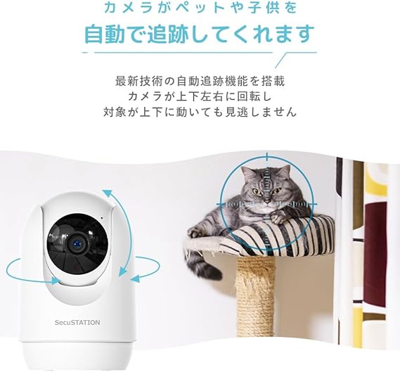 【自動追跡機能】最新技術の自動追跡機能を搭載。カメラが上下左右に回転し、対象が動いても見逃しません。ペットや子供をしっかり追跡してくれます。
